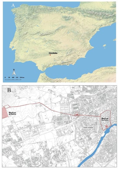 Location map of Córdoba (A). Location of the excavation area against the plan of modern Córdoba (Source: Instituto de Estadística y Cartografía de la Junta de Andalucía). In red, the road that skirted the arrabal to the south, which ran from the ʻĀmir al Qurashi gate to Madīnat al-Zahrā̛ (B).