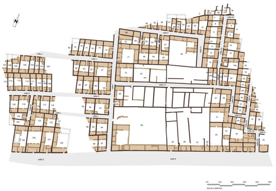 It seems clear that the layout was based on the road that linked Qurṭuba and Madīnat al-Zahrā̛, Street E, as most of the largest houses in the arrabal face this thoroughfare.13 The second urban axis is Street I, also lined by a row of large houses.14 The remaining houses, except for a few exceptions, are smaller, and the streets to which they open are narrower.
