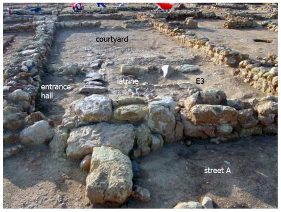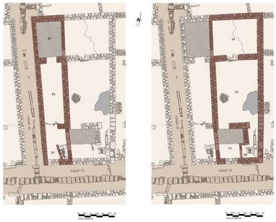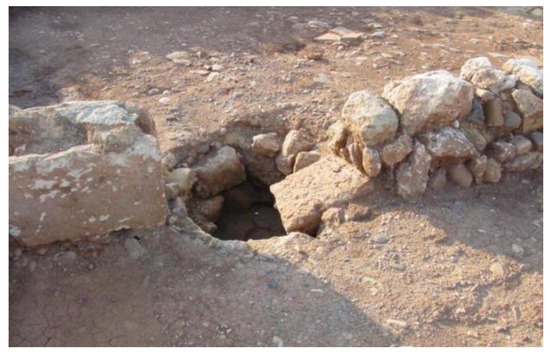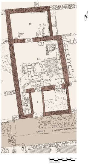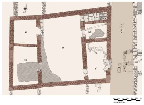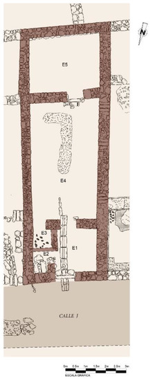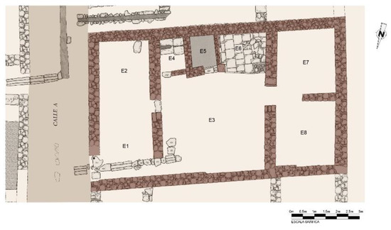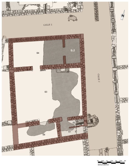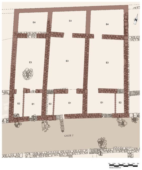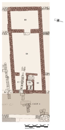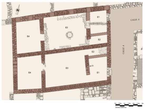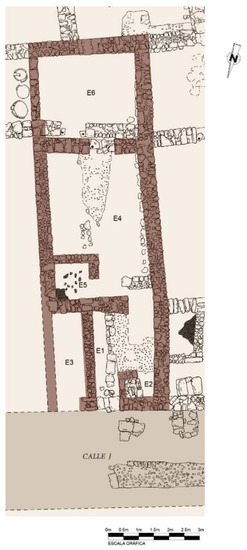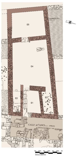 This variant includes a porticoed space in one of the sides of the courtyard; this is not a third full-blown bay, as in Type 3, because it is too narrow. Only House 12 responds to this model (74.36 m2). It is rectangular in plan and is divided into eight spaces (Table 5). The annex is on the southern side of the courtyard, and it is less than 2 m wide, while the bays are over 3 m wide (Figure 20). This area is divided into three spaces open to the courtyard, the latrine and two other rooms which have been identified as a possible pantry or a washroom and a small room used to cook, judging by the substantial deposits of charcoal found within it (Aparicio Sánchez 2017, p. 193, Figure 12). The former is 2.60 m2 and is paved with clay tiles, while the latter is much smaller, 1.45 m2, so its function must have been restricted to cooking (Figure 21).