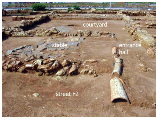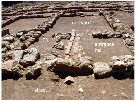 Houses 37 and 38, and, less certainly 75 and 101, may have used this additional space as a stable. In 37 and 38, the stable was accessed from the entrance hall, from which they were separated by a parting wall, as clearly attested in House 38 (Figure 7). In both instances, the room is paved with schist and calcarenite slabs, pebbles, and other stones for ease of cleaning (Figure 7 and Figure 8).