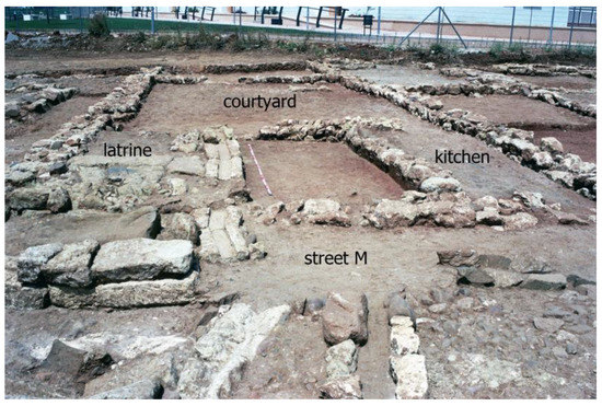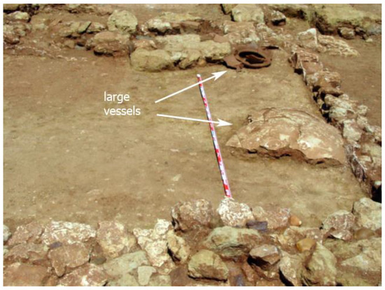 In other instances, this space was used as a storeroom, like in House 113, in which this room is the largest of the bay by some distance (Figure 9). The entrance hall is 2.99 m2 in size and the latrine 2.34 m2, while this additional room is 6.87 m2. It opens to the courtyard; the walls were lined in red-painted stucco, and the floor was made with ground stone; large storage ceramic vases were found inside (Figure 10).