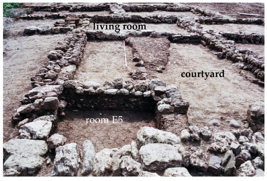 Finally, in Houses 111 and 124, this space was used as a kitchen. They are small rooms (2.94 m2 and 3.42 m2, respectively), open to the courtyard, and they were characterised by the presence of substantial ash and charcoal deposits, suggesting that they were used for cooking (Figure 11 and Figure 12).37