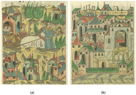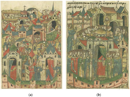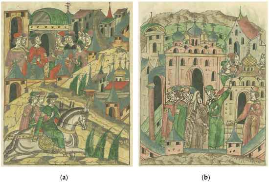 Aside from their documentary functions, chronicles often include literary elements of folkloric legend as well as Orthodox hagiography. From the 12th century onward, chroniclers were likely appointed by archbishops, making the chronicle an essentially ecclesiastical chronicle (Timberlake 2001, p. 197). Ostroswki goes so far as to say that the chronicles incorporated “propaganda” (Ostrowski 2002, p. 145) of the Russian Orthodox church. Religious and secular authority were deeply intertwined, and their interests played a role in chroniclers’ decisions about which events to record and how to record them. During the 15th and 16th century, when it is believed that most chronicles were produced in their current form, the Orthodox church was cooperating with the Moscow tsars to articulate a framework of spiritual legitimacy for Moscow’s nation-building project, which was then in its early phases (Bogatyrev 2007; Filyushkin 2018; Billington 1962, pp. 31–32). Traces of this are apparent in both the Novgorod and Pskov chronicles. The absorption of Pskov into Moscow’s territory is narrated in the chronicle as a triumphant event, with the bishop greeting the new tsar with the words “God bless you, our sovereign, for having taken Pskov without a battle” (Savignac 2016, pp. 151–52). The chronicles thus advance a hagiographic view of ecclesiastical leaders, the authorities primarily responsible for their compilation, and additionally depict princes, especially those from Moscow, in a similar light.