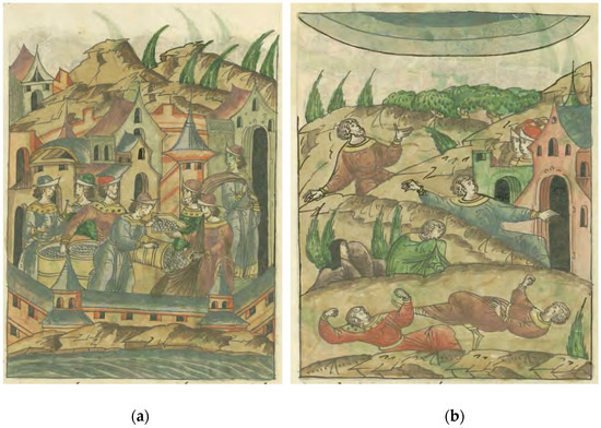 Subsistence crises in Novgorod. (a) Crop failure, 1412; (b) plague, 1417. The Illustrated Chronicle of Ivan the Terrible, Osterman Volume II. Library of the Russian Academy of Sciences.
