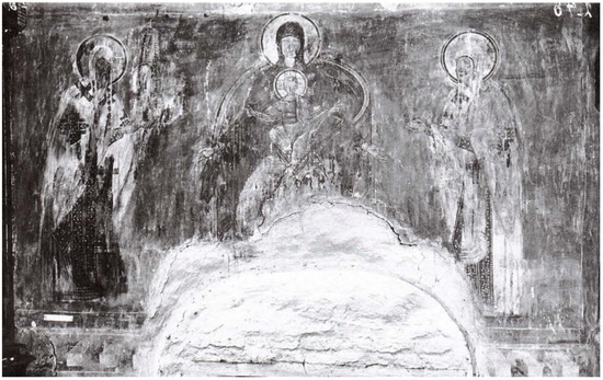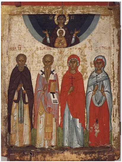 - Matsulevich, L. A. 1910. Bogomater’ Na Trone c Mladentsem Khristom i Arkhiepiskopy Moisey i Aleksey [The Mother of God Enthroned with the Christ Child and the Archbishops Moisey and Alexei]. Photograph. Novgorodskoe Obshchestvo Lyubiteley Drevnosti. Available online: https://www.icon-art.info/hires.php?lng=ru&type=1&id=4560 (accessed on 1 February 2023).