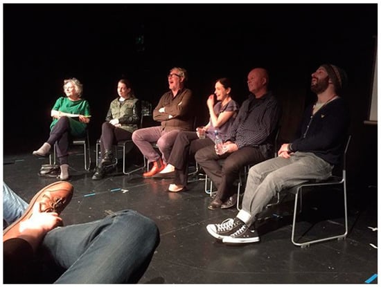 Participatory methodologies were inherent throughout production. As part of the process, script approval was sought from the couple and granted within a process wherein actors met their “character” and small living room performances were conducted in Lisa’s home. We, myself as director/writer, the actors and the producer, were custodians of the couple’s agency and negotiations between all participants became exchanges of social and representational power. Within the project, such power was dispersed, re-negotiated and reproduced in the new works. From a personal perspective, Lisa and John was actualised after the first performance of The Lisa and John Slideshow at Derby Theatre in March 2017. Although the couple could not attend due to illness, two of their children, Clare and Nickola, both of whom featured within Pictures from the Real World, were present. By prior arrangement, Nickola joined the actors, producer, Professor Val Williams and I, for a public discussion after the performance, sharing the platform and contributing to the discussion. Her presence on-stage as former subject extended the dialogical premise of Lisa and John. See Figure 7.