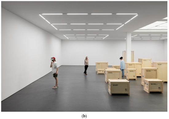 At around the same time, in June 2022, a retrospective of Sander’s work opened at the Esther Schipper Gallery in Berlin. Directly and indirectly, the exhibition addressed the effects of COVID-19 restrictions on art viewership that included travel restrictions, a learned aversion to physical copresence for fear of contagion, and the corresponding relegation of social encounters to online platforms where experience was digitally re-formatted.13 In these circumstances, Sander had the artworks from twenty-two previous exhibitions carefully packed in their transport crates along with corresponding materials lists and installation instructions, labelled, and shipped to the gallery, where they were arranged, unpacked, like minimal sculptures throughout the space. To “see” the works encased in their containers, visitors employed hand-held viewing devices through which they could virtually encounter the work as it had been exhibited elsewhere. Entitled “What You See is Not What You Get (22 Exhibitions)”, the presentation generated a contradictory tension between seeing the work and being there (Figure 1). One could either encounter the work in its present-but-hidden state or view the work as seen elsewhere at another time. The reunion of visibility and presence that marked the Copenhagen exhibition remained emphatically unavailable to visitors in Berlin.