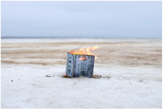 Aware of the paradoxical frailty of what seems to be most “solid”, in another photograph from the project DOM, Borissova depicts a paper maquette of a decrepit khrushchevka set in an empty field of snow, consumed in flames (Figure 2). It burns. There are no living creatures in sight. No screams, suffering, or violence seem to emit from the inside. The apartment block in no way aspires to naturalism and is revealed as a mere document object model implanted into a rather unusual environment. It is a concept taken out of context, a theatrical illusion that has served its purpose and is being erased. The spectator looks at it from the safety of their (now) outside position: What is presented as a home from one perspective is seen as a burning in the distance from another. Unlike a real inhabitant of a Soviet khrushchevka, the spectator has the privilege to walk in and out of “home”, to step away from one theatrical set and step into another. They have the freedom to get away should there be any alarming smell of smoke. Home is being seen from various angles, while each photograph mediates a field of encounter, probing the boundaries of the meaning of “home”: What if it is a dark corner with a window?; What if it is burning?; What if it is a memory, a feeling? The spectral nature of the photographic medium helps to affect the spectator into a “beyond” of home; to view it is as a spacing with a textual drift running through it. Unlike “home”, however, photography is forgiving: It does not capture for too long. But, likewise, it gives no promise of a resting place, a safe abode, or a home.