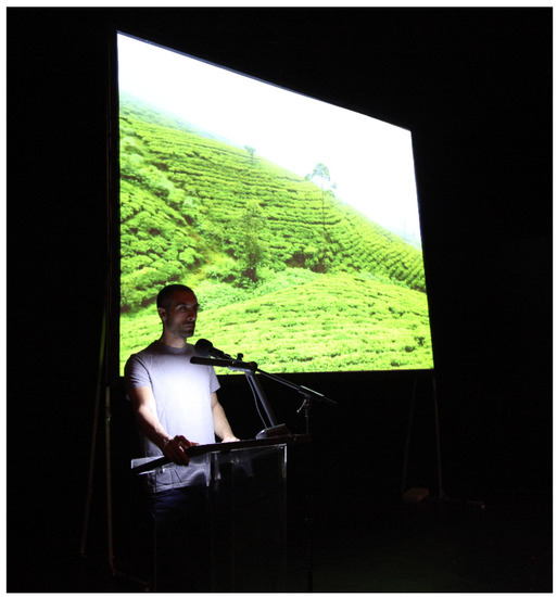 The artwork titled In the Land of the Gilead, initially researched and written by Tavori, was divided into 24 sections (based on the format of the Homeric Iliad) and provides a “grand journey” through Oliphant’s life, as well as an exploration of colonialism and its impact on contemporary geo-politics in the Middle East and elsewhere (Tavori 2012). The sections are divided into two types of presentations presented alternately: The first type was presented live by Tavori (and sometimes by other actors) who performed as Oliphant, and read one of his texts (for example, his description of the Saugeen first nations with whom Oliphant signed a territorial agreement when he was Superintendent of Indian Affairs). See Figure 1. The second type of performance consisted of a more contemporary text or another historical text written by another author, in both cases relating to the same events. Thus, after we hear of Oliphant’s sojourn with the Saugeen in Canada, we see another performance, pre-recorded rather than live, in which an actor reads from the lawsuit presented by the Chippewa and Saugeen first nations in 1994, claiming 80 billion dollars as compensation for breaking Oliphant’s promise to protect parts of their territory in return for handing over other areas to the white settlers—a promise that was perhaps never given in earnest. The work begins with colonised Sri Lanka where Oliphant lived as a child—a son of a high-ranking colonialist official (his house has now turned into a boutique hotel)—and ends with Oliphant’s last home in Daliat el Carmel, which has been turned into a memorial house for the Druze fallen soldiers. In between, Oliphant—like a Victorian Forrest Gump—appears in Kathmandu, the British-Chinese Opium wars, the Polish uprising, Chechnya, Canada, the English immigration to the U.S., and of course the Middle East and Ottoman Palestine.