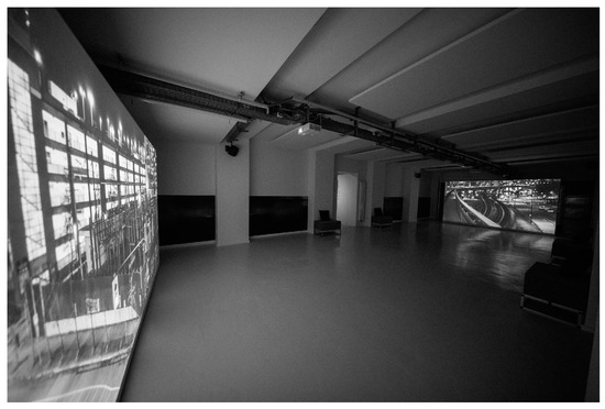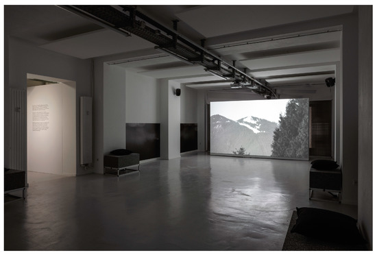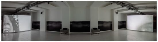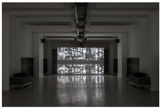 The use of an artificial light source (projection) to present the work links the presentation of its images back to a “capitalist, technical civilization” in which nothing “is seen simply as it would appear of its own accord” (Böhme and Thibaud 2016, p. 203). In For the Record, the final rallying cry of Antwi for capitalism “to go fuck itself” (Antwi in Antwi et al. 2021) might best be served by accentuating the commodification of the image itself, by embracing and amplifying its artificiality and its aestheticization in the gallery space (Figure 17). This reflects physicist Karen Barad’s hypothesis that matter has discursive properties and the ability to convey meaning without the use of language (Barad 2007). Perhaps we can even argue that matter itself can go on to convey themes even beyond those originally intended by the filmmakers.