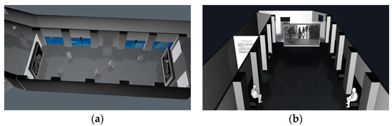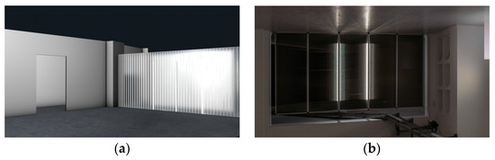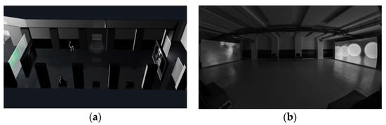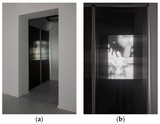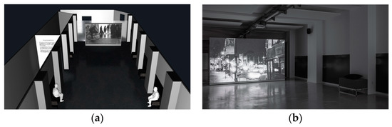 Through the use of polycarbonate screens, visitors are prevented from entering the exhibition space except through a narrow passageway that is a buffer between the work and the gallery reception area (Figure 9a,b). This passageway was designed as a threshold space, an architectural strategy that “leads the occupant to question their surroundings, thus leading to heightened awareness of the space as a transformative threshold between distinct spaces” (Zimmerman 2008). The aim is to distance the visitor from the outside world they just left and to sensitise them to the film world they are about to enter. By asking for a certain mode of attention from the visitor, the threshold space helps set up the idea of opacity within the work and of a labour of spectatorship.