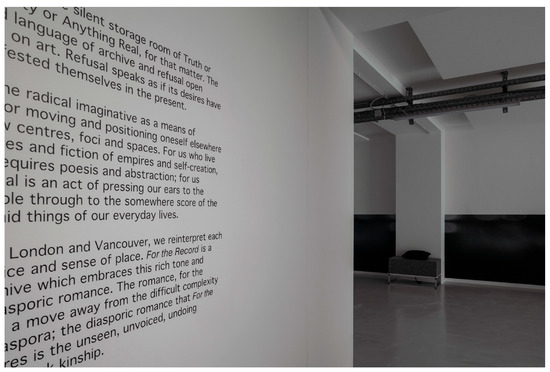 Reflecting on the postcolonial use of “haunting”, Storr describes a work that “rather than being overcome by what’s happened historically” operated as a “ghost for future encounters” (Storr in Antwi et al. 2021), an archival object that moulds to the situation it needs to be in at that time or a work that can be a “witness to the present, provides information on the past and can mediate with a future” (Wiens 2019, p. 126). This opens up the possibility that the orientation of the map may change based on who, when, how, and where the work is presented. Such site specificity exposes the work to conventions and discourse particular to the location, or in the words of scenographer Sigrid Merx, it defines the “space as host, content as ghost” (Merx 2020, p. 155) (Figure 7). In this role, the gallery exceeds the function as a container of art to provide a social function, an “arena of exchange” (Bourriaud 2009, p. 17). The artwork is viewed as a relational object in which each element must be considered in terms of the benefit or harm it may cause to all those entangled (Bourriaud 2009). In the case of For the Record, this is a “responsibility to the other that makes life possible for you” (Antwi in Antwi et al. 2021). Rather than aligning the organisation and staging of aural, visual, and material elements towards a singular message through the display of an artefact that carries only the artist’s intention, the gallery can activate a plurality of relationships. The exhibition space becomes not merely a backdrop but takes an active role in inviting spectators to situate themselves within the work and in relation to their lived experience (Wiens 2019). Treating the design and staging of the space as one that can kindle intersubjectivity rather than as a direct communication has the capacity to generate “understanding through the sensual, emotional and aesthetic responses of the viewer” (Wiens 2019, p. 11).