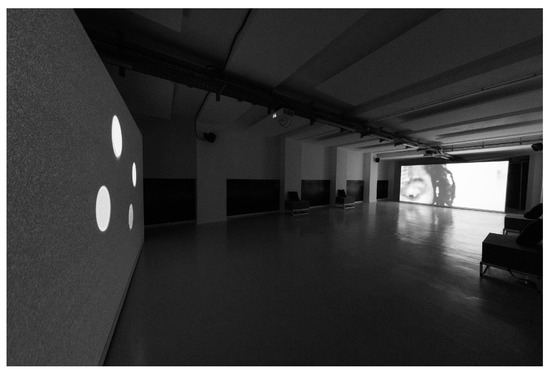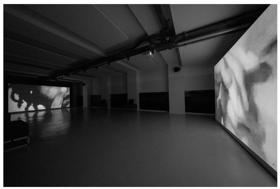 For the Record utilises black and white imagery throughout its 48-min run time. Edited as a diptych, there are points in the film where just one image was shown on a single screen, when both screens showed an image, and when neither screen had an image and was left black. The gallery was lit by the ambient light of the images, which helped choreograph the spectator’s gaze (Figure 16). The impact of the space as screens switched from darkness to bright white amplified the qualities of the image, creating “a meeting between material and a sensation” (O’Sullivan 2006, p. 56). This meeting foregrounded the relationship of the body in the photos for the spectator, recalling the phenomenological potential of the film experience as defined by Maurice Merleau-Ponty: “[t]he movies are well suited to make manifest the union of mind and body, mind and world, and the expression of one in the other” (Merleau-Ponty 2019, p. 111).