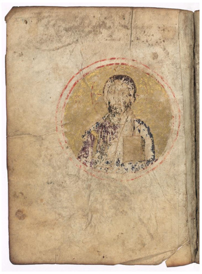 For this earliest phase of manuscript production at the lingua, the one major example of figurative decoration examined here is the medallion bearing the bust of Christ Pantokrator in a psalter ascribed to the monastery, Vat. Barb. gr. 322, f. 117v (Figure 3), and which is painted on a single leaf inserted between the second and the third quire (see Hutter 2022, pp. 755, 757). This means that it is not strictly related to the manuscript’s overall decoration in carmine (as it is not embedded in such ornaments), though the latter should be attributed to the chief decorator in the workshop, who was extremely skilled with pen (see below). The painting is almost effaced, especially in the area shaping Christ’s face and pallium, where the fall of pigments has uncovered the underlying drawing. This drawing seems to have been drafted with ease by a skilled Byzantine hand, which sketched the bust of Christ on an empty sheet and filled the background within the compass circle with gold leaf, along with the book he depicted in Christ’s hand. The miniature was then retouched with carmine so as to frame the golden medallion and to apply the nimbus and the nomen sacrum. No further requests were made of the artist. Indeed, it appears he was asked to make—or occasionally made—an image of Christ that followed the standard iconography, perhaps intended to complement the psalter at its origin: it is found between the quires containing the end of the first and the beginning of the second part of the psalter, according to the Byzantine usage, and the decorated strip at the side (psalm 77) is the only one in the entire manuscript displaying the gold leaf. Such an insertion may have been intended as a proper icon meant to receive the reader’s prayer (Parpulov 2017, p. 304), and it also matches the triumphal tone of the following psalter, which praises God’s mighty power.