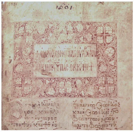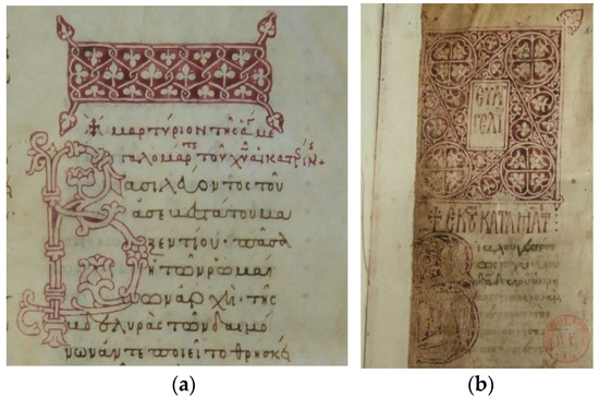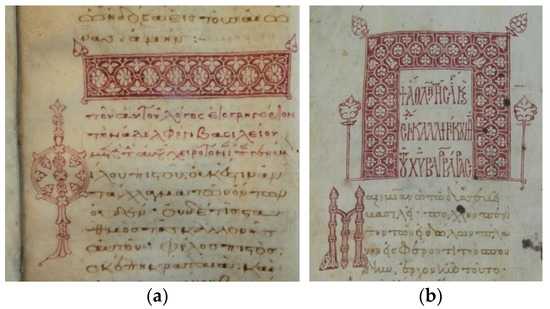 The Rubricator/George is therefore an instance of a copyist/drawer who, on the one hand, attends to the completion of the manuscripts he has written, but on the other hand is asked to manage the carmine ornamentation of books made by his fellow copyists. He enriches the texts’ beginnings and headings, produces decorated letters, large and small pylai, at times even independently from the initials nearby, as is the case in the Mess. gr. 69, where a second hand (less talented but not less creative and practiced) draws with a thinner trait (Figure 5a), or in the Vat. gr. 1349. The Rubricator was possibly training fellow monks; or he was at least flanked by skilled and ambitious companions, such as the one who illustrated a Gospel in Paris, Suppl. gr. 1266 (Figure 5b), in which the first pyle can be directly connected to George’s Lectionary Vat. gr. 1601 (Perria 1974; Hutter 2022) (Figure 6), or San Salvatore’s Euchologion in Oxford (Bodleian Library, Auct. E. 5.13), so far ascribed to Rossano, Trigona or to Messina itself (Hutter 1982, pp. 109–10).