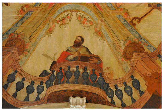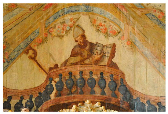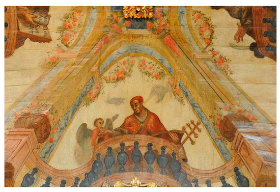 The depiction of Saint Gregory the Great as a Black man in the ceiling above the high altar in the church of Santa Efigênia in Ouro Preto has also been subject to varying interpretations and assumptions about the artist’s race (Figure 3). Saint Gregory is shown with the other three doctors of the church (Figure 4 and Figure 5). This iconography appears in several other churches in the region, but elsewhere, all four doctors are portrayed as white. When Jair Afonso Inácio cleaned and restored the painting in 1968, he not only remarked on the “Black pope”, but also claimed that the three other figures were Black (Trindade 2019, p. 77). Lázaro Francisco da Silva described the three other doctors as having Black physical features, and Nancy Nery da Conceição, relying heavily on Silva, described them as pardos (Silva 1995, p. 70; Conceição 2016, p. 63). Other scholars have been more cautious, often only naming one of the other doctors as mixed race, such as Tania Tribe, who describes Saint Ambrose as mixed race (Tribe 1996, p. 75). How the distinction between white and mixed-race figures is being made is, however, unclear. All three figures have the same color skin on their faces and hands, full beards, similar facial features, and those without head coverings have the same wavy hair. In fact, some recent publications mention a Black Saint Gregory, but do not mention the race of the other doctors or describe them as white. Assumptions have also been made about the ceiling’s painter. Silva suggests that not only the Black Saint Gregory, but also the sculpted iconographic elements that he associates with Yoruba religion, were potentially created by a Black artist, possibly “some slave who worked with his master,” while Benatti, Teruya, and Maio propose that the Black Saint Gregory was painted by a different artist than the other doctors (Silva 1995, p. 71; Benatti et al. 2022, p. 15). Moreover, those scholars associating the Black Saint Gregory with rebellion, an enslaved artist, and with Chico Rei, the legendary king who is said to have funded the church of Santa Efigênia, often mistake the papal camauro for a Phrygian cap, a symbol of liberty (Silva 1995, p. 70; Conceição 2016, p. 57; Trindade 2019, p. 58).