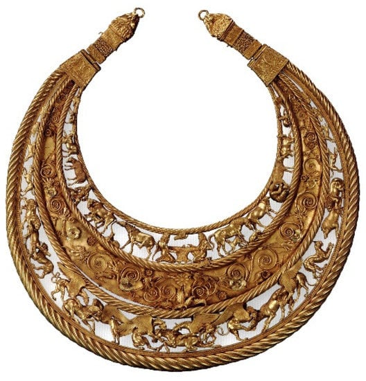 Pectoral from Tovsta Mohyla. Treasury of the National Museum of the History of Ukraine. AZS-2494. Gold, enamel. Weight 1149 g, diameter 30.5 cm (source: Dally 2007, fig. 2).