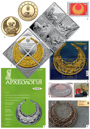 Pectoral in modern life: 1, 2—coins National Bank of Ukraine; 3, 4—postage stamp of the Ukrposhta (Ukrainian Postal Service); 5—cover of the journal «Archaeology» of the Institute of Archeology of the Academy of Sciences of Ukraine; 6, 8—pectoral monuments in Kyiv (6) and Donetsk (6); 7—commemorative sign of the theater award «Kyiv pectoral» (source: author of the collage, Leonid I. Babenko).