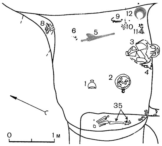 Plan of the dromos of the central tomb of Tovsta Mohyla (source: Mozolevskyi 1979, fig. 31). (1—bronze vessel; 2—Greek bronze bowl; 3—amphora; 4—iron hook; 5—a sword; 6—fragment of a knife; 7—belt and quiver; 8—a knife; 9, 10—remnants of a whip; 11—quiver; 12—pectoral; 35—remains of the skeleton of a servant).