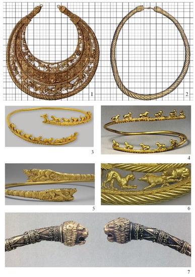 The ornament from Tovsta Mohyla was identified as a pectoral from the moment of its discovery. However, pectorals are not widespread among the Scythians, and the genesis of that type of adornment is not fully understood. A direct succession from Urartian pectorals is not possible due to the considerable chronological gap. The Thracian breastplates do have a number of similar features, but they differ in structure and functional purpose. Meanwhile, many elements of the pectoral’s morphology reveal correlations to torques of the same era. The most prominent correlations include the configuration of false twisted braids, adornments in the shape of animals and people, and ornamental finials in the form of lion heads (Figure 4). This leads us to concur with the numerous researchers who view the pectoral from the Tovsta Mohyla as a particularly complex version of a torque, which was regarded as one of the most prominent societal status symbols by the Scythians. Overall, the pectoral’s design includes elements that suggest it was influenced by a variety of cultures—both by the local toreutics from the region of the Bosporan Kingdom on the Kerch and Taman peninsulas and by innovations borrowed from the Achaemenid, Thracian, and Greek cultural environment (Babenko 2018, pp. 187–204).