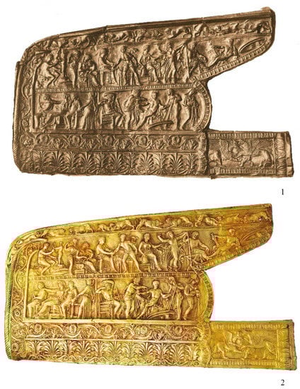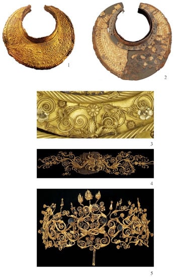 The metalsmith who produced this masterpiece borrowed many ideas from different cultural environments. One noteworthy influence may have been derived from the Eastern Balkan prehistoric and ancient cultures. In particular, many researchers believe that Thracian and Macedonian breastplates could have had a considerable influence on the pectoral’s design (Mantsevich 1976, pp. 83–98; Meliukova 1979, pp. 204, 205; Boardman 1994, p. 210; Treister 2005, p. 63). The similarities include the overall shape and size, the depiction of figural decoration in concentric compositions, and the centerpiece ornamentation consisting of intertwined plant shoots. The connection of the pectoral with the Western Balkan region is even more evident. Elements of the plant ornamentation, including the spiral tendrils, palm fronds, and acanthus leaves, constitute the central section of both the golden pectoral and the diadems from Vergina and Stavroupoli (Figure 5) (Babenko 2020, pp. 45–52).