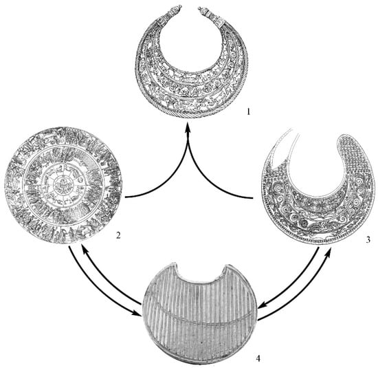 A hypothetical chain of influences that gave rise to the pectoral shape in the northern Black Sea region: 1—pectoral from Tovsta Mohyla; 2—a hypothetical reconstruction of Achilles’ shield according to A. Monticelli; 3—pectoral from Varbitsa; 4—pelta shield on the gold comb from the Solokha mound (source: Babenko 2021b, fig. 6).