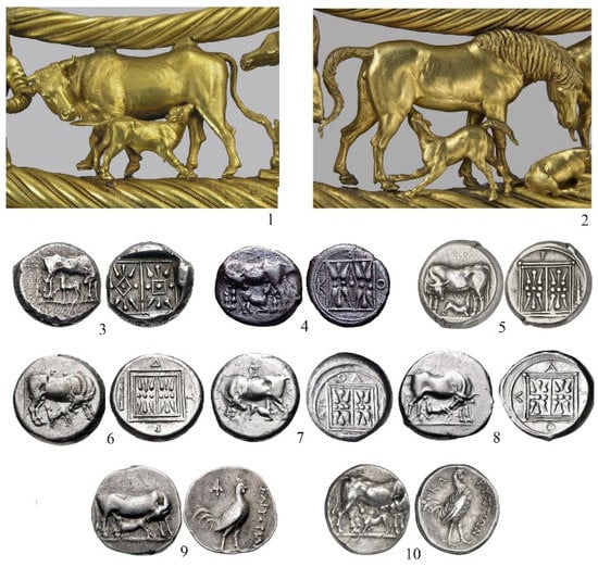 Scenes of a cow feeding a calf: 1, 2—details of the animal scenes on the pectoral from Tovsta Mohyla; 3—10—images on ancient coins (3, 4—Corcyra; 5, 6—Dyrrachium; 7, 8—Apollonia; 9, 10—Karystos) (source: Babenko 2017a, figs. 1, 3).