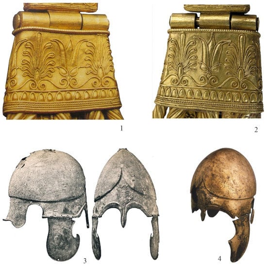 Hinges of the Tovsta Mohyla pectoral: 1, 2—detail of the pivot hinges of the pectoral; 3, 4—helmets with hinged cheek guards (source: Babenko 2017b, figs. 2, 3).