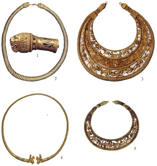Scythian chest and neck decorations—torques and pectorals: 1 Kul-Oba (detail); 4—Kul-Oba; 2—Solokha; 3—Tovsta Mohyla; 5—Bolshaya Blyznitsa (source: Babenko 2019b, figs. 3–5).