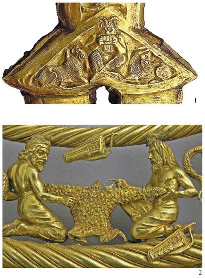 The comparison of two masterpieces of Greco-Scythian toreutics—the silver amphora from Chortomlyk and the gold pectoral from Tovsta Mohyla (Figure 11)—has become a tradition since the discovery of the pectoral. Both objects share a number of expressive similarities, such as the three-part structure of the composition with identical themes—scenes of nomadic daily life represented by miniature high-relief figures, griffins and feline predators tearing into prey, and zones of floral ornament animated by figures of birds and other figural details.