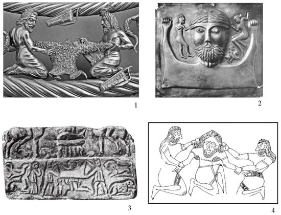 Foreign cultural parallels to the central scene: 1—pectoral from Tovsta Mohyla (detail); 2—Gundestrup cauldron (detail); 3—Moesia marble tablet (detail); 4—bowl of Hasanlu (detail) (source: Babenko 2022a, fig. 2).