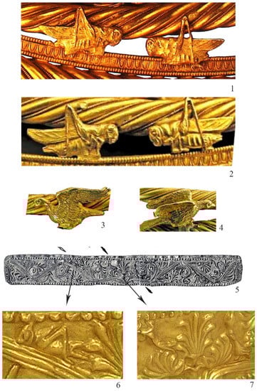 Peripheral characters of the pectoral: 1–4—pectoral from Tovsta Mohyla (details); 5–7—gold sheet plaque from Tovsta Mohyla headdress (6, 7—details) (source: Babenko 2016b, figs. 1–3).