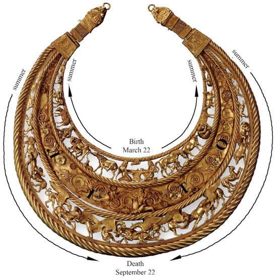 The interpretation of the central scene in the pectoral’s upper frieze is plagued by the greatest diversity of opinions (Babenko 2013, pp. 111–13). Additional information for solving this problem can be extracted from the compositional structure of the pectoral itself and the numerical structures embedded in it. The imbalance between the number of deaths in the lower frieze (seven) and births in the upper frieze (six) provides reason to interpret the dominant meaning of the central scene as also containing the idea of birth or rebirth, i.e., the seventh in number. The symbolism of the number seven is embodied in the composition of the pectoral and by the seven bird figures, as well as in the seven-part structure of the pectoral itself, consisting of four twisted torques and three figure-decorated or ornamental friezes between them.