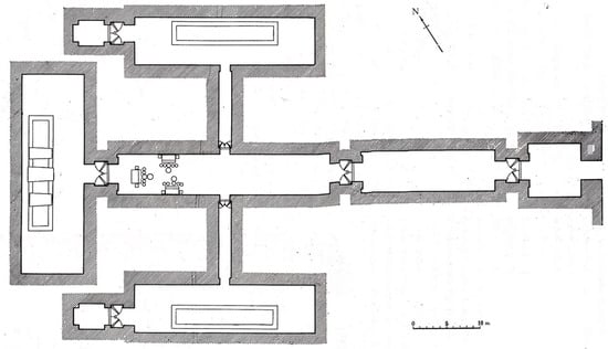 Such a power relation among the three tomb occupants can also be observed through the layout of the three spirit seats in the middle chamber (Figure 3). Setting an empty seat surrounded by sacrificial objects in tombs had been a funerary custom in China since the Han Dynasty (206 BC-220 AD). Believed to host the invisible soul of the tomb occupant, the spirit seat was a significant feature of premodern Chinese burials, and thus its placement and setup were carefully thought out (Wu 2010, p. 64). In the Dingling Mausoleum, the spirit seat of Emperor Shenzong is placed at the center among the three seatings (Institute of Archaeology et al. 1990, p. 19). Shenzong’s high status is signified by the seat’s large size and its position on the central axis of the tomb layout. In front of the emperor’s spirit seat is the seat of Empress Xiaoduan placed against the west wall of the chamber. It is slightly smaller than the emperor’s, thus showing Xiaoduan’s subordinate position to the emperor. The seat of Xiaojing is located on the other side facing the seat of Xiaoduan. Compared to Empress Xiaoduan’s seat, the seat of Xiaojing is farther away from the emperor’s. This difference in the physical distances between each seat to the emperor’s symbolizes the seatholders’ different political proximity to the emperor. In other words, Xiaojing was seated further away from the power center than the empress, and thus has a lower political status.