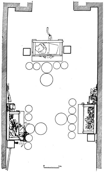 This particular relationship among the three tomb occupants can be further observed from the placement of the coffins in the inner chamber. Here, the relationship among the three tomb occupants is presented as the husband being highest in the hierarchy, and his two wives being both hierarchically subordinate. The coffin of the emperor was placed at the center and flanked by the coffins of Xiaojing and Xiaoduan on two sides (Figure 2). While the size of the emperor’s coffin is larger than the other two, the sizes and shapes of the wives’ are almost the same (Institute of Archaeology et al. 1990, pp. 22–23). The central position and the larger size of the emperor’s coffin indicate his domination within the household. The comparable placements and sizes of Xiaojing and Xiaoduan’s coffins suggest the women’s comparable relationships to the emperor as his spouses. However, whereas both coffins of the emperor and the empress are made of wood from the rare and prestigious material of phoebe zhennan, the coffin of Xiaojing is made of much less expensive pinewood. This suggests the subordinated position of Xiaojing to both the emperor and the empress (Institute of Archaeology et al. 1990, pp. 22–23).