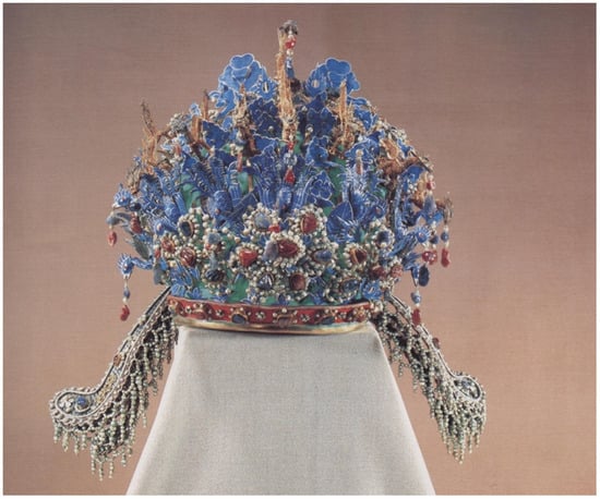 The complexity of Xiaojing’s political status and the multiplicity of her identities is demonstrated by the set of coronets found in the Mausoleum. Out of the four richly adorned coronets, two belonged to Empress Xiaoduan, while the others belonged to Xiaojing (Institute of Archaeology et al. 1990, pp. 205–6). According to Yufu zhi 輿服志, a set of official dress codes included in Ming Shi (明史 History of Ming), a coronet decorated with dragons and phoenixes was the standard formal head accessory for royal women during important ceremonies. The empress’s coronet should include exactly nine jade dragons and four golden phoenixes. The quantity, material, and composition of other motifs such as flowers and clouds on coronets for noble women of various statuses are also specified.6 None of the coronets found in Dingling corresponds to the official codes, which may suggest either a change in the regulations that the written history failed to record, or a transgression that was not uncommon during the Wanli period (Volpp 2005, pp. 145–49). Nevertheless, we might still determine the status of Xiaojing from her coronets through comparing them to those of the empress’s. One coronet of the empress has nine dragons and nine phoenixes, and the other has six dragons and three phoenixes (Institute of Archaeology et al. 1990, pp. 205–6). Interestingly, the designs on the two coronets of Xiaojing suggest two different hierarchical relationships between her and the empress: one of Xiaojing’s coronets is simpler than either of Xiaoduan’s, with only three dragons and two phoenixes—a coronet that is suitable for a consort ranked below the empress; but Xiaojing’s other coronet outshines both of the empress’s, with an astonishing twelve dragons and nine phoenixes (Figure 5) (Institute of Archaeology et al. 1990, pp. 205–6). No other woman except for the Empress Dowager would have been allowed to possess an extravagant coronet such as this one.