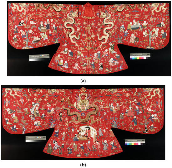 | 24 | While the baizi motif became popular on textiles especially since the Ming dynasty, few pieces of clothing with this motif have been preserved or are on display. I have not been able to locate any other examples of baizi jackets from the Ming period. But I have encountered a few women’s jackets with baizi motifs from the Qing dynasty. One example can be found in the collection of Beijing Institute of Fashion Technology (It was on display in 2022 at the Institute. See http://biftmuseum.com/news/detail/27112, accessed on 15 June 2023). While this piece also features an overall symmetrical composition and portrays several childplay activities similar to the Dingling jackets, it does not seem to arrange the figures in such a systematic way to deliver a consistent message, as in the case of the Dingling jackets. If anything, the parade scene appears at the front center of all of the Qing examples that I have encountered and seem to be the visual emphasis. This scene is also Ided at the front center of the Dingling baizi jackets, but is not the only visual focus of the entire garments, as will be discussed in the paper. The Qing examples are also a lot less extravagant in terms of material and technique. I thank the anonymous reviewer for raising this point. |