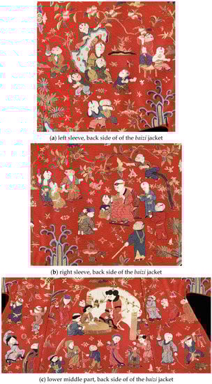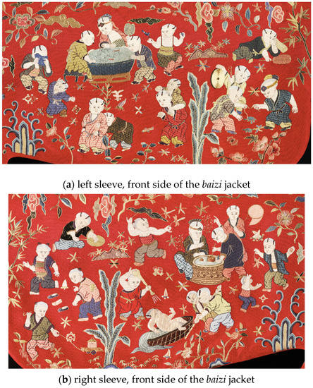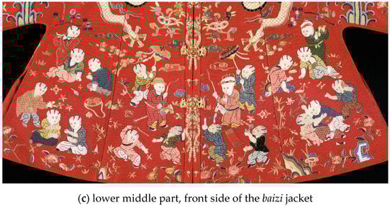 Moreover, an examination of the one hundred boys on the jackets further reveals that the design of the baizi jackets was not only about the assertion of political power, but specifically about a power that belongs to the mother of the emperor. As I have mentioned previously, a number of scholars have discussed the development of the hundred-boys motif from the Song Dynasty to the Qing Dynasty. They largely agree that during the Ming and Qing period, the baizi motif developed into a standard auspicious symbol of producing numerous sons, which was believed to be the foundation of a happy marriage and a prosperous household (Yang 2014, p. 37; Bartholomew 2006, pp. 58–60). But in the case of Xiaojing’s jackets, it seems that the traditional motif of one hundred boys at play is reappropriated through their carefully arranged layout, groupings, and activities in order to highlight the relationship between the elderly and the young.24 In particular, it is the caring for male children by older women that is subtly emphasized through these images.