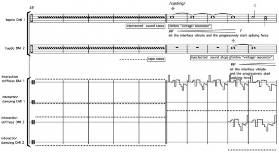 Even though the author has been musically experimenting with these concepts long before, the first time they were officially put in practice, live in an artistic context, was in 2012 with the musical composition for two force-feedback devices, Engraving–Hammering–Casting, which was composed in collaboration with Edgar Berdahl (Berdahl and Kontogeorgakopoulos 2012). In order to create both sound and haptic force-feedback, a virtual physical model of vibrating resonators was designed and utilised both for sound synthesis and as haptic digital audio effect. The Falcon 3D robotic feedback device from HapticsHouse (NovIt in the past) was selected as the haptic device since the HSP framework included the appropriate drivers. Ergotic interaction was an integral part of the compositional medium. The music celebrated materiality in the digital realm and the way craftsmen skillfully interact with their tools. Figure 2 depicts a section of the music score where the interaction and physical model parameters are notated.