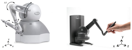 Another professional haptic device from the range of products available from 3D Systems was found suitable for these objectives: 3D Systems Touch, illustrated in Figure 1, together with its local coordinate system (CSYS) and the pivot joints B1, B2, and B3 which enable the translation in x, y, z directions of the gimbal joint (equivalent to pivot joint B2) and the three possible rotations of the stylus pen. It is a slightly lower-end version compared to the Touch X device used to control the mass–spring–dampers model described in the previous section, but still offers highly accurate force feedback at the gimbal position, through very silent internal motors located at the joints A1, A2, and A3. The pen-shaped stylus and its flexibility of motion afforded by the device’s system of joints allow for an accurate reproduction of the bowing gestural motion, with the user being able to hold the pen in a similar way to holding a real bow.