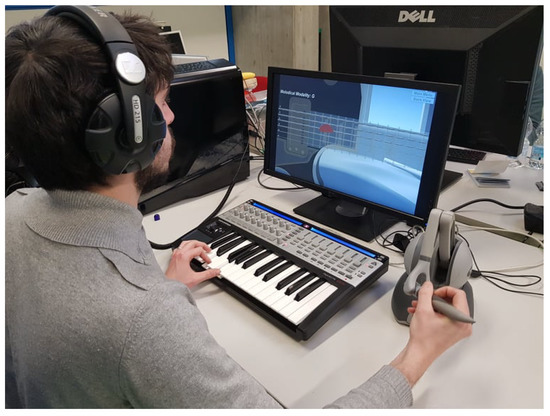 The tone fundamental frequency was then set by reading data from the keyboard in Figure 2, thanks to Keijiro Takahashi’s Musical Instrument Digital Interface (MIDI) communication software for Unity3D. (https://github.com/keijiro/MidiJack, accessed 22 February 2023).
