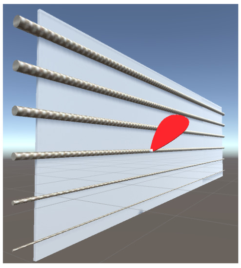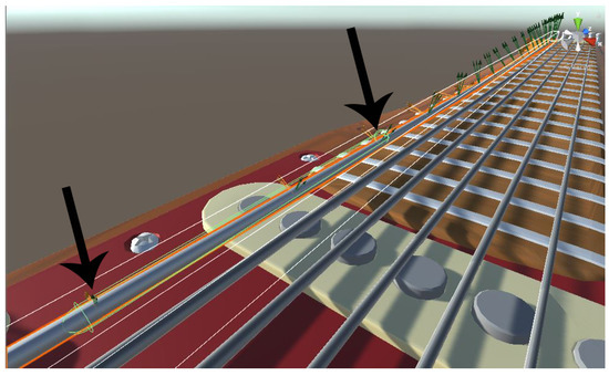 Visual feedback was designed by placing our two dynamic components, plectrum and strings, over a passive background depicting a guitar in a simple rehearsal room. As opposed to the plectrum, whose movement is directly manipulated by the performer, the strings needed to be animated by following plucking with visual patterns of vibration. These patterns were enabled by the Ultimate Rope Editor asset (https://assetstore.unity.com/packages/tools/physics/ultimate-rope-editor-7279, accessed 22 February 2023) available from the Unity3D Marketplace. This asset allows one to compose visual strings made of a variable number of sections and nodes. Then, several pseudorealistic physical parameters such as string tension, string weight, and breaking force can be set on each string, determining its dynamic behavior in response to an external force.