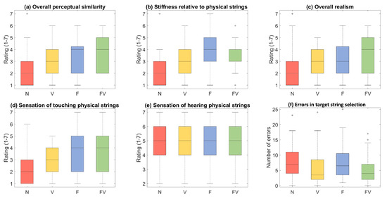 Each participant evaluated five attributes on a Likert scale (see plots labeled (a)–(e) in Figure 6). At the end of the test, each participant was additionally asked to choose the preferred condition. Finally (see the unlabeled plot (bottom right) in Figure 6) all the errors made by plucking the wrong string instead of a visually marked string during a part of the test involving individual plucking were logged. Results suggest the existence of significant effects of haptic feedback on the perceived realism of the strings.