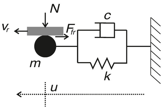 As shown in Figure 8, the model consists of a mass m [kg] coupled to a rigid support via a parallel system comprising a linear spring with spring constant k [N/m] and linear damper with damping coefficient c [kg/s]. This mass is then excited by a rigid and weightless stick that is placed onto it with normal force N [N] and moved at a rubbing velocity [m/s]. Its displacement relative to its resting position at time t [s] is denoted as [m] and is described by the following ordinary differential equation (ODE) of the second order: