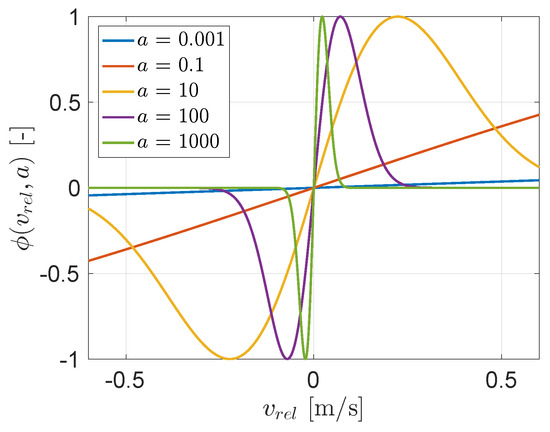 stating that an externally supplied bowing force [N], localized at the bowing point [m] along the length by means of a Dirac function , is scaled using a nonlinear function which gives the friction characteristic. This function depends on the relative velocity [m/s] between the bow and the string at the bowing location, and on a friction parameter a [s/m], which gives the shape of this nonlinearity and essentially tunes the frictional behavior.