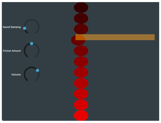 The real-time application was developed using the JUCE framework and written in C++. A demo video is available at Onofrei (2022c), and Figure 10 depicts a screenshot of the application in operation, which runs at a sampling frequency = 44,100 Hz. Eleven mass elements are positioned in the center of the application window and appear as red-filled circles. The lower the natural frequency, the darker the tone. They are tuned with a continuous interval of 27.5 Hz from a resonant frequency of 55 Hz up to 330 Hz, but other musical scales can easily be chosen in a recompiled version. The stick which is used to excite the masses is depicted as a long, variable-opacity rectangle. When it is not in contact with the masses, it is depicted as gray, and as orange when it is. Increased opacity is proportional to the amount of normal force applied to the masses by the stick, N. The displacement of the masses resulting from the simulated physical interaction is updated at a rate of 24 frames per second in the application window, giving the user with visible feedback. The rubbing velocity, , is given by the longitudinal velocity of the stick.