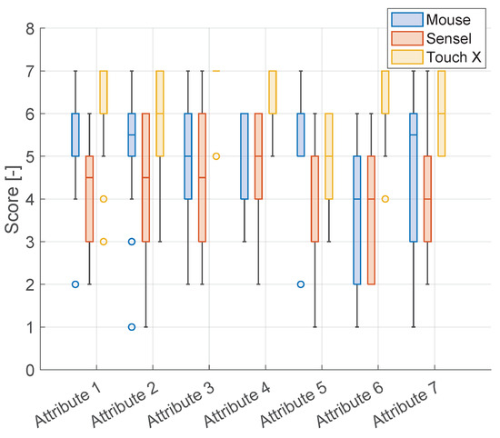 Boxplot visualizing the results related to the 7 questionnaire statements for the three control devices.
