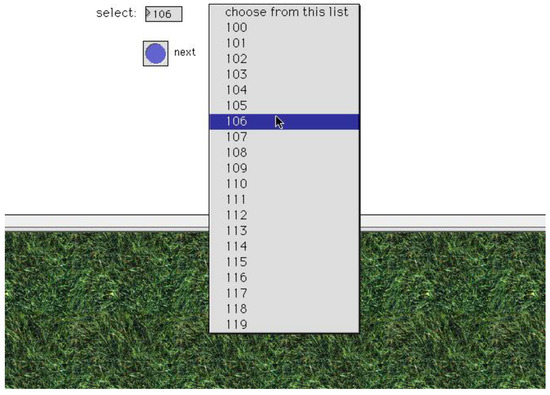 The menu contained 20 items, a list of numbers from 100 to 119 as shown in Figure 3. All 20 values (the cues) would occur twice, from a randomly generated table in a fixed order so that the data across conditions could be easily compared—all distances travelled with the mouse were the same in each condition.
