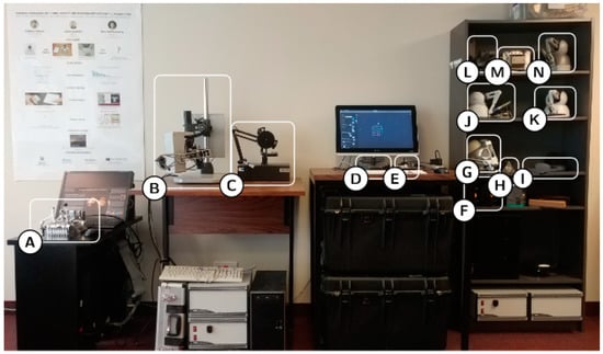 Several force-feedback devices used in force-feedback musical applications at the Input Devices and Music Interaction Laboratory, McGill University, Canada (IDMIL). From bottom-left to top-right: (A) ACROE ERGOS; (B) MPB Technologies Freedom 6S; (C) SensAble Phantom Premium, (D) and (E) two Haply Pantographs; (F) two FireFaders built at IDMIL; (H) Novint Falcon and (G) removable end effector; (I) Logitech WingMan mouse; (J) and (K) two SensAble Phantom Omni; (L) SensAble Phantom Desktop; (M) a second ACROE ERGOS; and (N) 3D Systems Touch.