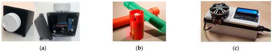 Modularity and evolution of the TorqueTuner from () and (). The first two models, (a,b), are based on the Mechaduino platform. Model (c) is based on the Moteus platform due to the recent unavailability of the Mechaduino platform. (a) Standalone haptic knob (Mechaduino-based) by (). (b) T-stick adapter (Mechaduino-based) by (). (c) Workbench with presets (Moteus-based) by ().